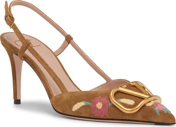 Floral embroidery and velvety suede bring a boho spirit to this VLOGO-embellished pointy-toe pump that balances the retro influences in an elegant slingback silhouette.