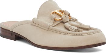 Little tassels accent the golden VLOGO hardware of this calfskin-suede loafer made for even easier wearing in a mule silhouette.