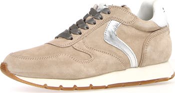 A wavy contrast panel swipes the side of a supple suede sneaker that exudes heritage style.