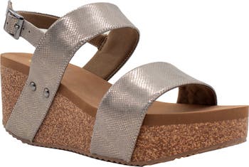 Polished studs and bold straps accentuate the retro-chic style of a must-have platform wedge sandal.