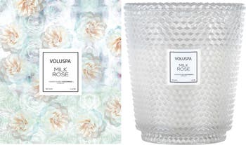 Fragrance story: Voluspa's largest format in an embossed glass design sends fragrance wafting from each of its five wicks. Designed to be featured as a centerpiece both indoors and out, its glass was designed to emulate layered petals, each carved with a classic geometric cube pattern. It's softly colored with a sheer iridescent glow to match real life rose petals. It includes a lid to protect from dust when not in use. When burning the candle, place the lid underneath as a tray. Voluspa candles are hand-poured in the United States from sustainable, ecologically sound, pesticide-free manufacturing. The candle features a proprietary coconut wax blend and a 100% cotton wick.