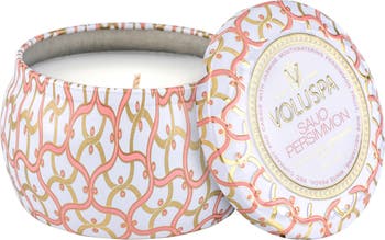 Fragrance story: A sweet liaison of pulpy, fresh persimmon engages in a delicious flirtation with nectarine, peach, red currant and cassis. Billowing bouquets of white jasmine round this ultimate mouth-watering, scent. This fruity, fragrant fling has the makings of a passionate, long-lasting love story. Voluspa candles are hand-poured in the United States from sustainable, ecologically sound, pesticide-free manufacturing. The candle features a proprietary coconut-wax blend and a 100% cotton wick.