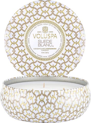 Fragrance story: Wrap up in a comfortable jacket of soft, supple well-worn suede. Low-key, mellow and infinitely smooth—its sultry caress envelops all in a veil of smooth sensuality. Suede Blanc is the accessory that complements any style. This Voluspa candle is hand-poured in the USA from a coconut wax blend and features three 100% natural wicks for a clean, fragrant burn. The decorative tin and matching lid help keep the candle dust-free when not in use.