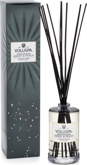 Makassar Ebony & Peach is a fresh blend of black ebony wood, ripe peaches and apple blossom.