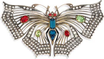 The fashion house draws inspiration from vintage heirlooms with this butterfly-shaped brooch made from antique-finish bronze studded with multicolored crystals.