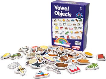 Vowel objects are a set of 40 magnetic foam vowel objects in a box. Begin to teach vowels in an interactive, hands-on and fun way as children identify objects and sound out their vowel sounds such as goat, owl and fork. Each piece measures approximately 2.