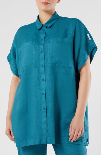 From the always-travel-ready Voyage collection, this button-up tunic is made stealthily practical in a cut from breathable garment-dyed linen canvas that allows it to double as a poncho.