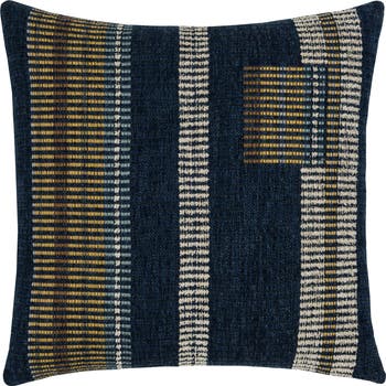 The Voyage pillow features a linear pattern composed of stacked geometric lines, creating bold, modern stripes on a deep, textured ground.