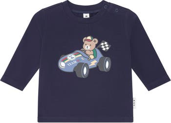 A long-sleeved round neck top in classic navy. Made from cloud-like organic cotton, it features tummy-sized Huxbear racecar embroidery.