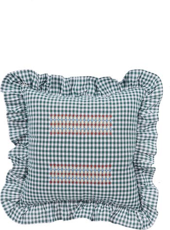 Hand-embroidered cotton cushion, made with classic forest green-and-white gingham.