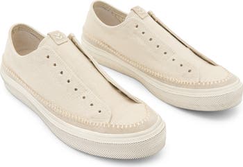 John Varvatos removes the laces from a classic lace-to-toe sneaker clad in cotton and linen to create a slip-on with an iconic profile and a laid-back simplicity. A hand-stitched band of soft suede connects the upper to the lightly distressed rubber cupsole to ground the look with an instant old-favorite feel.