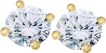This classic matching pair of studs features 2 round brilliant cut moissanite stones. Both stones are prong set in solid 14k yellow gold findings. Each earring is secured by 14k yellow gold screw backs.