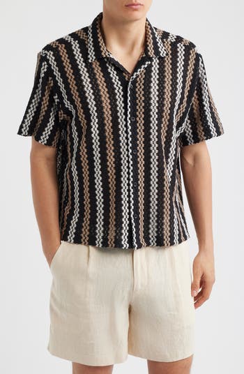 Tactile openwork stripes woven into the cotton-enriched fabric fabric make this camp shirt a getaway essential that'll see you stylishly from the pool deck to dinner at the resort.