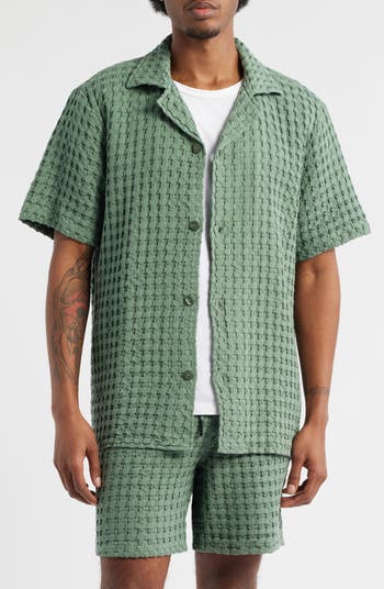 A woven grid that puts rich texture against the breathable cotton fabric makes this camp shirt a getaway essential that'll see you stylishly from the pool deck to dinner at the resort.