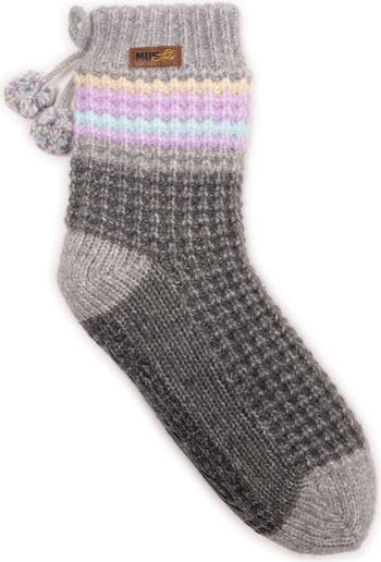 Waffle-knit stitches and tiny poms softly texture these breathable crew socks topped with a signature logo patch.