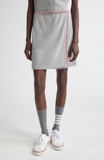 Tricolor striped trim and a nametag appliqué provide a signature finish to this wrap-style miniskirt cut from lightweight, waffle-knit cotton for textural dimension.