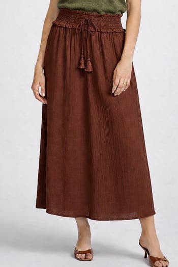 Flowing wide leg pants feature a smocked waistband with adjustable drawstring and tassel ties, offering lightweight movement, soft drape, and an effortlessly flattering silhouette for relaxed yet polished everyday styling.