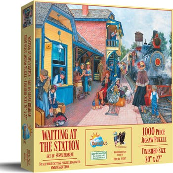 Immerse yourself in the nostalgic charm of a bygone era with SunsOut Puzzle's exquisite 1000 piece "Waiting at the Station" jigsaw puzzle, portrayed vivaciously through Susan Brabeau's vibrant artwork of a lively train station. Feel the high-quality craftsmanship that defines SunsOut as you piece together the interlocking 20" x 27" puzzle, unfolding a story filled with intricate characters and vintage details. Created in the USA from durable, eco-friendly recycled cardboard and soy-based inks, our large, full-color box display guide ensures a satisfying, frustration-free experience. SunsOut takes pride in its dedication to customer service and sustainable practices, offering a worry-free warranty for swift resolutions to any issues with missing or damaged pieces. Ideal for adult enthusiasts and collectors, this captivating puzzle not only provides entertainment and challenge but is a sublime gift for train and art lovers or anyone appreciating a touch of nostalgia. By choosing SunsOut, a proud, women-owned small business, you support a company championing quality, creativity, and community values. Add "Waiting at the Station" to your collection and relish a timeless piece of art, reflecting American craftsmanship at its best.