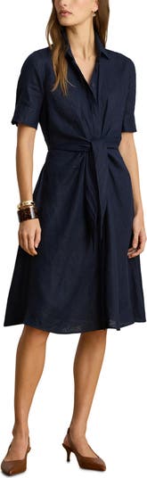 Breezy linen brings effortless ease to this shirtdress, designed with a tailored bodice anchored by a tie detail at the waist for a flattering, defined shape. Button-cuff short sleeves and a concealed placket keep the look polished, while the fluid A-line skirt adds soft movement.