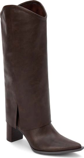 A curved topline and foldover shaft create a Western-inspired aesthetic on a faux-leather boot shaped in a knee-high profile and lifted by a stacked heel.