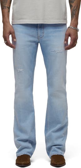 Made from low-stretch denim with distressed details, these vintage-inspired jeans feature extralong legs with insets that create a flared profile.
