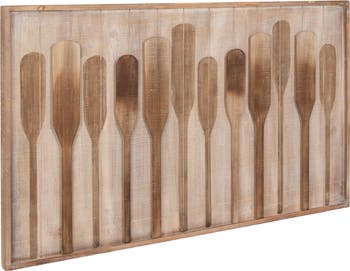 This wood framed wall décor with raised paddles is a unique and eye-catching wall décor piece. It features a combination of attached and outlined paddles in different colors and sizes. The paddles are made of metal and have various colors and finishes, such as white, blue, green, red, and silver. Some of the paddles are attached to the frame, while metal wires outline others. The paddles create a dynamic and dimensional effect that draws attention and interest. The wall décor piece has a wood frame that has a brown finish, giving it a warm and cozy look. It has an integrated hanging mechanism that allows it to be hung horizontally. This wall décor piece is ideal for adding some nautical, coastal, or lake house vibe to any home. It can also complement any industrial, farmhouse, or boho style décor. It is excellent for decorating any living room, bedroom, kitchen, or hallway. This wall décor piece measures 47.25 inches in width and 28 inches in height. These wall décor pieces are a fun and unique way to add a touch of nature to the home.