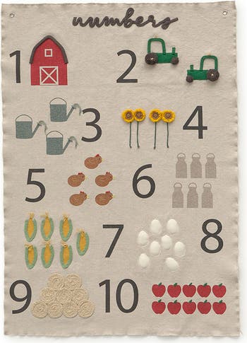 Ready to learn numbers with the Wall Hanger Farm! This cotton wall hanger, made from natural canvas, features farm-themed objects and numbers from 1 to 10. With details like fabric, ropes, and fringes that pop from the canvas, this piece is both educational and decorative. It showcases a unique mix of handcrafted techniques for that signature “Lorena” look—embroidery, prints, hand-crafted pompoms, custom-mixed cords, and mini eggs. A true one-of-a-kind creation. Lots of techniques mixed together to give it fun “lorena” look - embroidery, prints, pompoms hand details , mixed cords done only for this product, mini eggs filled with polyester one by one by hand before closing.