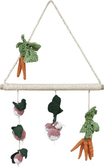 Decorative wall hanger with handmade cotton carrot and radish hangers from a cotton covered wooden stick, and with a twisted cotton cord for hanging on the wall.