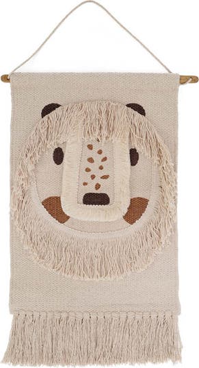 A pretty hand woven and printed wall decoration in natural and easy to combine colours. This pretty lion with a natural mane and a tender gaze is a real favorite that will seduce both children and parents. It is made of pure cotton and ready to hang thanks to its wooden support. © Nattiot - registered design