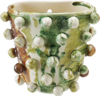 Add the Terra-cotta Wall Planter with Balls in Reactive Glaze to introduce a touch of artistic charm and organic texture to a home. This handmade terra-cotta wall planter is a beautiful sculptural piece, featuring a round silhouette adorned with dimensional balls and a stunning reactive glaze in a mix of green, white, and brown. The unique finish and subtle color variations ensure that each planter is completely one-of-a-kind. It's the perfect accent for Farmhouse, French Country, Modern, and Abstract Garden interiors, effortlessly blending rustic charm with refined artistry. Made of durable terra-cotta, the planter measures 8 inches in length, 5.25 inches in width, and 7.5 inches in height. This piece provides a beautiful and unique way to add a touch of greenery to a wall.