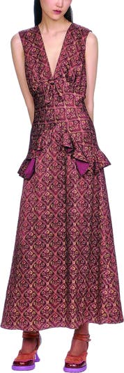 A statement maxi with vintage-inspired charm—featuring a bold print, ruffle detail at the hip, and a sweet bow accent.