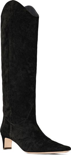 A curved topline lends Western-inspired appeal to a stylish boot balanced by a slender square toe and blade kitten heel.
