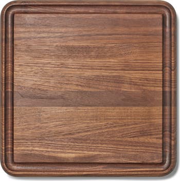 Whether carving a roast or presenting charcuterie, this walnut wood butcher block makes everything you serve a bit more grand. Designed with a groove on one side to catch juices, it's made from edge-grain wood that's naturally antimicrobial, gentle on knives and stays steady while you work.