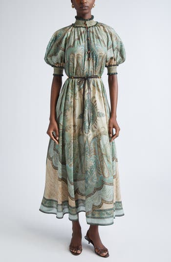 Shirred accents and billowed sleeves further the retro/romantic character of this free-flowing silk dress with a placement print that unfurls like an ornate paisley tapestry. Gilded rouleau buttons and a braided leather belt complete the boho-eclectic look.