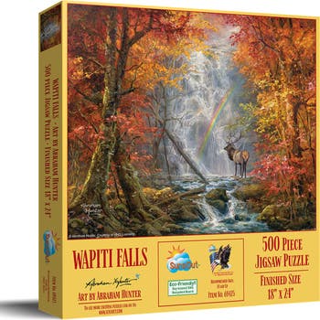 Experience the breathtaking majesty of nature with the 500-piece Wapiti Falls jigsaw puzzle. Designed by acclaimed artist Abraham Hunter, this artwork transports you into an enchanting waterfall scene, surrounded by vibrant autumn foliage and a magnificent elk, which measures 18" x 24" upon completion. With interlocking pieces made from high-quality recycled cardboard, SunsOut puzzles ensure a seamless assembly process and a robust build for repeated use. Proudly made in the USA by a woman-lead small business, this puzzle not only provides you with a serene source of entertainment but also champions an ethical cause. By employing eco-friendly soy-based inks and recycled materials, SunsOut guarantees each puzzle to be as sustainable as it is visually delightful. With a customer-focused approach, SunsOut further offers a worry-free guarantee, committed to addressing any issues about missing or damaged pieces promptly. Conceived as much more than a puzzle, Wapiti Falls is a portal into the painstakingly sculpted landscape, serving as an ideal gift that promises countless hours of leisure and relaxation. By inspiring appreciation for artistry, craftsmanship, and nature, this puzzle elicits beauty and emotion. This is not just a challenge but an invitation into a captivating, creative endeavor that brings the fragments of an awe-inspiring scene to life. Wapiti Falls is not just a puzzle; it's a piece of art that brightens your space and unlocks creativity with every piece you fit.