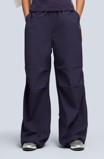 Lightweight woven parachute pants bring effortless, street-ready ease with a relaxed silhouette, adjustable details and a signature embroidered logo for subtle distinction. Fixed ruching along the back of the legs adds textured dimension, while roomy pockets add utility.