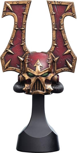 The waning years of the 41st Millennium are an age of constant war in which humanity stands on the brink of annihilation, with aliens and heretics alike threatening the Imperium from every quarter. Enlightenment is replaced by superstition, understanding by rhetoric, rote, and blind prayer. War is all that remains. WETA WORKSHOP and GAMES WORKSHOP Here at Weta Workshop, we've been fans of expansive worlds and epic adventures for as long as we can remember. Many of our artists' initial forays into the realm of fantasy began with Games Workshop's iconic miniature figures and imaginative battles. Feeling a strong connection with like-minded innovative companies and sharing a common passion for creativity and world-building, it made perfect sense for us to collaborate with the best; to infuse masterful craftsmanship into an intricate and ever-expanding universe. The result is an incredible new range of premium collectibles for all fans and collectors to savour and delight in. The bloodlust of Khorne burns within the souls of his Berzerkers, warriors who live only for slaughter in the name of the Blood God. Their blood-red helms are terrifying visages of death, crowned a symbol of their dark god. Each mark upon their armour is a testament to centuries of warfare, each skull claimed for the skull throne fuelling their ferocity further. With unmatched attention to detail, our artists bring the ferocity of the Khorne Berzerker to your collection. This replica captures the savage beauty of the helmet, from the deep crimson hues to the towering brass-trimmed crests. Crafted with precision and passion, this piece will incite the bloodlust in any Warhammer 40,000 fan, offering a perfect blend of artistry and brutality for your display. Features Comes with an accompanying stand for display Made in collaboration with Games Workshop Digitally sculpted by Weta Workshop artist Victo