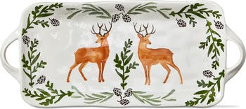 It's all in the details! Serve up appetizers and hors d'oeuvres alongside beautiful warm wishes stag art for the winter season. Made from earthenware, This platter features an organically shaped body with hand paint and hand stamp designs. Beautifully versatile and functional. This dishwasher safe rectangle earthenware serving platter with handles features 2 deer with pinecone and greenery borders accents on white background, Mix and match with a range of earthenware selections from tag.