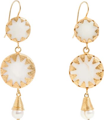 Wear our Warrioress Medallion Earrings to showcase your inner strength. These statement 18ct Gold Vermeil and Mother of Pearl drop earrings draw inspiration from a Native American warriorress' might and elegance. Pearl earrings that are a beautiful symbol of female courage.
