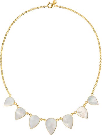 - Handcrafted using ethically sourced Mother of Pearl with 7 Mother of Pearl Pendants, and 18ct Gold Plated Sterling Silver Necklace.