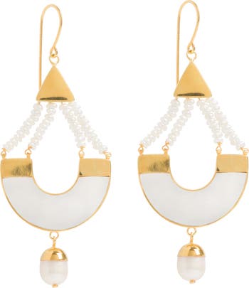 Elevate your elegance with the Warrioress Sunrise Earrings by Freya Rose. Handcrafted with genuine mother of pearl and 18ct gold-plated sterling silver, these earrings feature feminine geometric elements inspired by ancient storytelling.