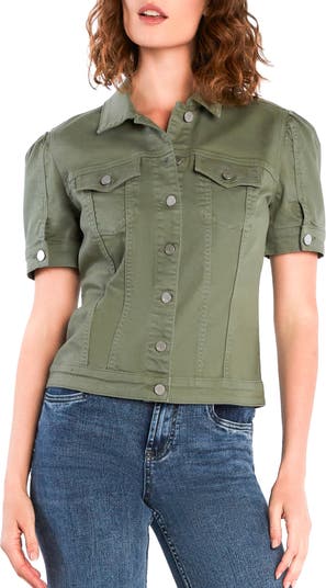 Short puff sleeves lend a boxy fit to this denim jacket that's a go-to staple for warm weather.