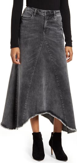 A skirt to set your your inner flower child twirling is made in edgy grey-wash denim that's finished with a fluttery, frayed hem.