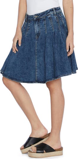 Easy-moving pleats lend swingy movement to this denim skater skirt.