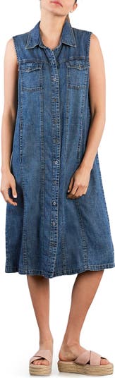 A sweet look for sunny days, this vintage-vibe denim shirtdress has an A-line silhouette and streamlined seams that highlight the mid-calf length.