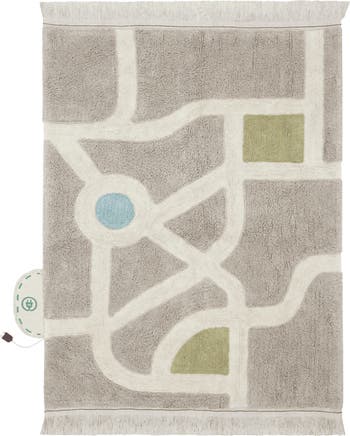 Made in soft cotton, this rug comes with a bag full of fun accessories to design your very own City. With Stone beige as the main color, the rug plays with high and low cut piles, showing a pattern of streets in Natural color, featuring a fountain in Aqua blue and parks in soft Olive color. The rug is finished with short fringes, and comes with artisanal made little cars, trees, traffic signs and a charging place for electric cars.