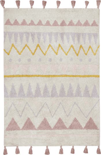 Soft cotton rug with a natural base featuring triangles and zigzag lines in a mix of Yellow, Pearl Grey, Nude, Vintage Nude, Dark Grey, and Vintage Blue, finished with matching tassels in coordinating colors. Available in Medium and Large sizes.