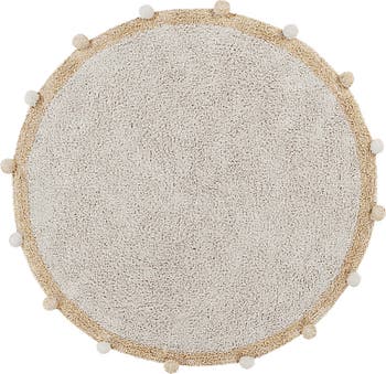 Round-shaped soft cotton rug, available in multiple colorways: Natural with a border in Natural and Honey, Soft Olive with a border in Natural and Olive, and Natural with a border in Natural and Vintage Nude. Each rug is finished with handcrafted cotton pompoms around the edges, adding a playful and stylish touch to any nursery, playroom, or cozy corner.