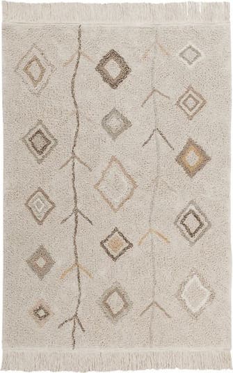 Rectangular rug with a natural base, featuring geometric patterns in soft, earthy tones. Available designs include elegantly mixed colors in Olive, Honey, Soil Brown, Ivory, and Vintage Nude, or a playful rhomb pattern inspired by Carol, Lorena Canals’ youngest daughter, combining up to 18 different colors. Each rug is finished with natural-colored fringes along the edges, adding a bohemian and handcrafted touch.