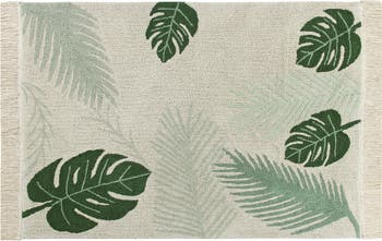 If you're looking to add a tropical vibe to your decor, you've come to the right rug! Put a piece of the jungle at your feet, with the bright color accents and oversized foliage featured in this design, enveloped in the freshness of cool natural cotton. Natural base with tropical green plants and natural color fringes at edges